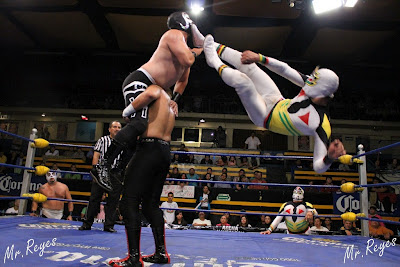 DRAGON LEE, DIAMANTE y TRITÓN Vencieron a RAZIEL, CANCERBERO y NIEBLA ROJA mediante descalfiación al perder la máscara Triton accidentalmente en un moviento de Raziel y este siendo descalificado.
