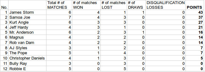 - Tras las victorias de este sábado en el house show de Memphis, donde James Storm ganó a Magnus y Mr. Anderson derrotó a The Pope, la clasificación del Bound for Glory series queda asi: