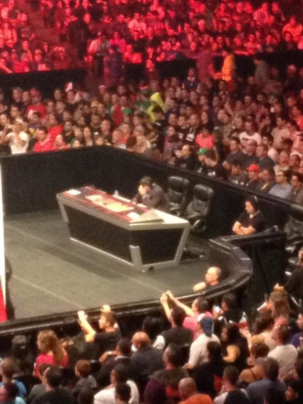Esta fotografía realizada desde las gradas del Bell Centre de Montreal nos muestra en estado en el que el compañero de Jerry Lawler, Michael Cole se ve muy afectado por la noticia que dimos hace unos minutos. A través de la televisión pudimos ver la cara de preocupación de Cole al darnos la información referente a Lawler de que no tenemos más novedades desde el final de la emisión de RAW