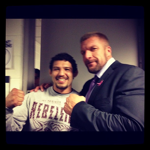 - Gilbert Melendez el campeón de los pesos ligeros de Strikeforce estuvo la noche del martes en las grabaciones de Smackdown, aqui tenemos un foto del luchador con Triple H