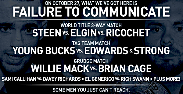 - Kevin Steen retuvo el título de la PWG tras vencer a Michael Elgin & Ricochet en una triple amenaza. Steen ganó tras aplicar un package piledriver a Ricochet en la espalada de Michael Elgin.