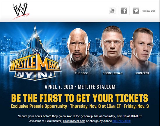 Si sois de l@s afortunad@s que os podéis permitir un capricho como este, esta información os vendrá muy bien. Si sois como yo que no tenéis un duro y ni siquiera habéis podido ir a Málaga, pues como curiosidad también vale. Lo cierto es que las entradas para el mayor espectáculo de la WWE ya están a la venta por Ticketmaster.com. Os lo apunto en euros, actualizado el cambio a día de hoy (tal y como están las cosas, igual mañana los precios son diferentes).