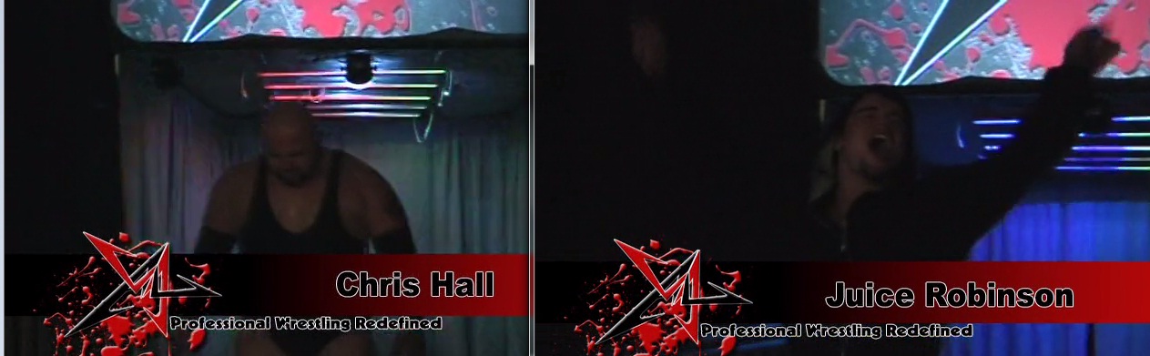 Por apariencia Robinson lleva las de perder ya que Chris Hall parece una bestia, Robionson aplica una serie de patadas a las piernas de Hall pero no le afectan mucho, y revierte facilmente esa ofensiva en base a movimientos de poder incluyendo un Splash, Juice contraataca con un suplex y lo celebra con un grito (por dios que me recuerda a Santino este Robinson pero mas griton), los golpes se ven cada vez mas lentos, al final de la pelea Robinson intenta una especie de huracanrana (o eso parecìa), Hall lo atrapa en el aire, lo revierte en una catapulta sobre el esquinero, Robinson salta a la cuerda evitando el golpe y aplica una plancha cruzada, Hall nuevamente lo atrapa y le aplica un Dragon Suplex a la velocidad de una tortuga. Mala la pelea, cero velocidad, obviamente esto es por el mastodonte de Hall, el personaje de Robinson no es malo, es como un personaje de comedia pero que puede atacar a sus rivales, y sus gritos sacaron más de una risa del público, pero la lentitud de todo no ayudó nada a la lucha.