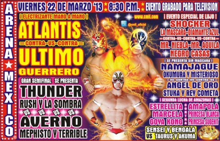 Atlantis venció a el Ultimo Guerrero por descalificación al el Ultimo Guerrero quitarle la Máscara a Atlantis.