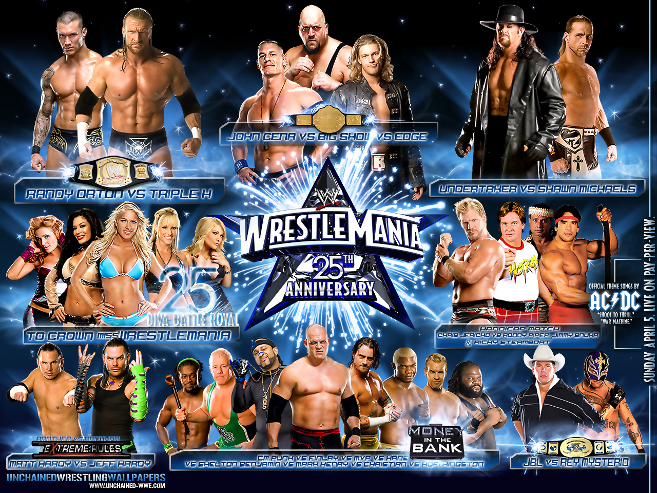 Wrestlemania 25, se celebró el 5 de abril de 2009 en el Reliant Stadium de Houston ante mas de 72.000 que abarrotaron  el recinto. El evento que debería haber estado a la altura, dejo bastante que desear sobretodo por el concierto de Kid Rock en medio del show. Entre los combates el mas destacado el de Shawn Michaels vs The Undertaker y en la cartelera como siempre los dos títulos, Randy Orton vs Triple H por el título de WWE y la triple amenaza entre Edge vs Big Show vs Randy Orton por el título del World Heavyweight Championship. Además tendríamos el combate entre los hermanos Hardy en un Extreme Rules, y el tradicional Money in the Bank.