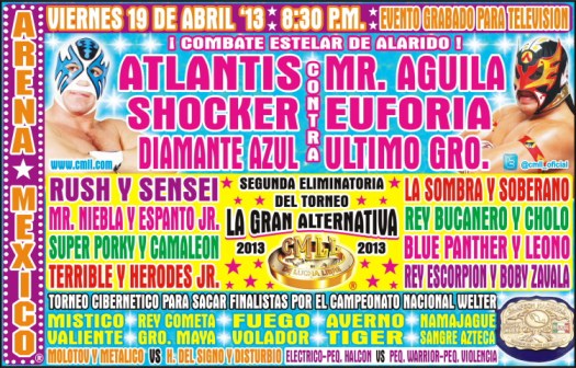 Rey Escorpión y Boby Zavala ganaron la segunda eliminatoria del torneo la gran alternativa en una eliminatoria en la que participaron tambien las siguientes parejas: El Terrible y Herodes jr, Cholo y Rey Bucanero, Blue Panther y Leono, Mr Niebla y Espanto jr, Rush y Sensei, Camaleón y Super Porky y la pareja formada por La sombra y el Soberano.