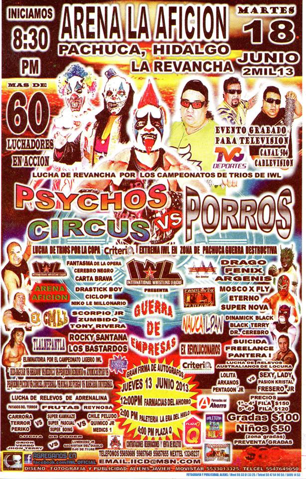 Los Porros, (Ángel o Demonio, Ovett y León Rojo) lograron ganar a los Psycho circus ( Psycho Clown. Monster Clown y Murder Clown) con descalificación de Psycho Clown por propinar golpe bajo a Ángel o Demonio y asi los porros son los nuevos campeones de trios de la IWL.
