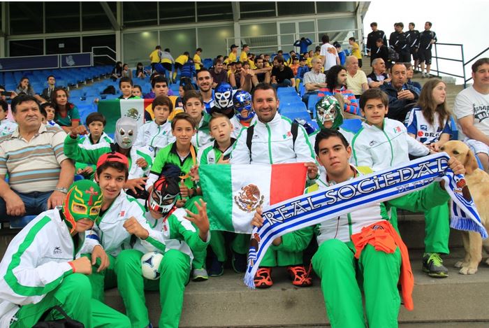 Estos días se celebra en la ciudad de San Sebastián la Donosti Cup, un campeonato de fútbol base a nivel internacional. En esta imagen que nos envían amigos participantes en el torneo se puede ver como los seguidores y jugadores méxicanos portan máscaras de luchadores. La Real Sociedad también tiene como fan un luchador enmascarado que se quiso hacer la foto con este grupo. Como vemos cada día son más frecuentes las máscaras de wrestling en los estadios de fútbol.