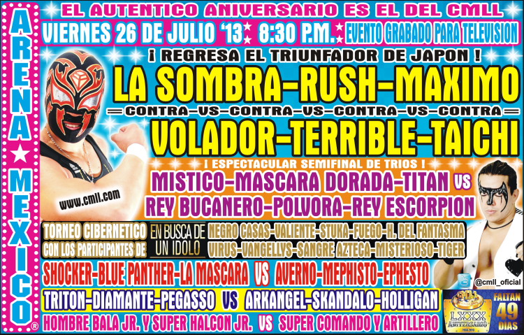 Volador jr, Taichi y El Terrible ganaron a Rush, Máximo y la Sombra, al quitarle la máscara Volador jr a la Sombra.