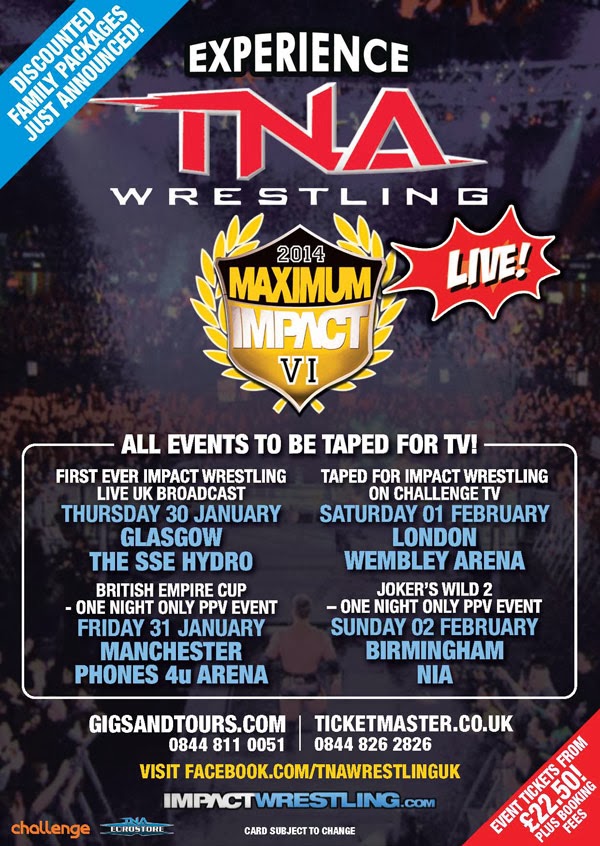 Dixie Carter mediante twitter ha anunciado esta tarde que en el próximo tour de TNA por Reino Unido, se harán las grabaciones de 2 Impact que serán los de los shows de 30 de enero en Glasgow, donde se incluirán segmentos grabados del show de Dublin del 29 de enero, y el show de Londres del día 1 de febrero. Además habrán dos PPVs, que se grabarán el viernes 31 en Manchester y el domingo 2 en Birmingham.