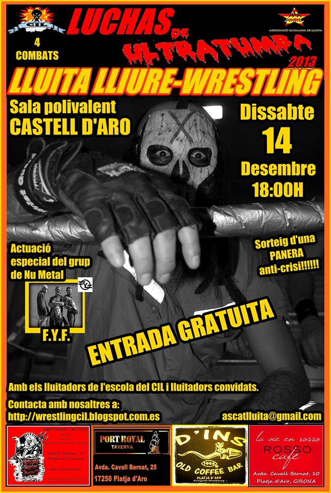 Un nuevo año ha pasado y el CIL se preparaba para dar inicio a su evento – Aniversario, Luchas de Ultratumba, la velada se presentaba interesante y los luchadores a pesar de que muchos de ellos ya habían peleado aquel mismo dia por la mañana, estaban ansiosos para entrar en las doce cuerdas. La velada se iniciaba con la actuación de la banda de Nu Metal F.Y.F. que atronó la sala polivalente de Castell d’Aro con su buena música. Una figura de inconfundible camisa hawaiana nos anuncia que van a empezar las hostilidades, y presenta a nuestro arbitro el licenciado Marshall, que iba a ser la ley durante aquella tarde tan especial.