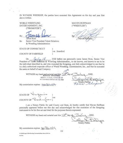 Para coleccionistas de WWE, una copia del contrato de Maven Huffman con la WWE está siendo subastado en la actualidad en eBay al módico precio de 999,99 dólares. Estas que os dejamos son las dos primeras páginas de las 24 que forman la totalidad del documento. La historia de este contrato es que el luchador dejó varias de sus pertenencias en un almacén para entrar en una clínica de rehabilitación. Al salir no pudo pagar el alquiler del almacen y este fue subastado. Lo ganó una persona de virginia por 100 dólares que una vez revisado encontró este material y lo ha puesto a la venta.