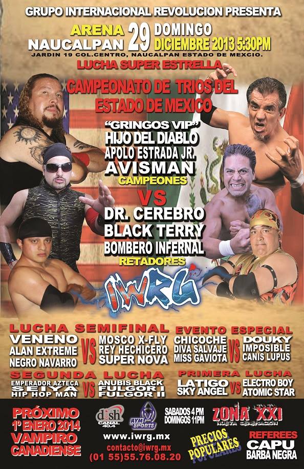 Los Gringos V.I.P. (Hijo del Diablo, Avisman y Apolo Estrada Jr.) retuvieron los títulos de tríos de IWRG al vencer a Black Terry, Bombero Infernal y Dr. Cerebro.