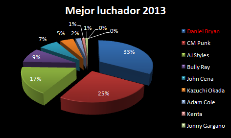 Tras haber revisado las votaciones de nuestros usuarios y haberlo anunciado en la edición de la semana pasada de Xtreme Pressing aquí os dejamos el gráfico de las votaciones, en las que Daniel Bryan ha conseguido proclamarse mejor luchador de 2013.