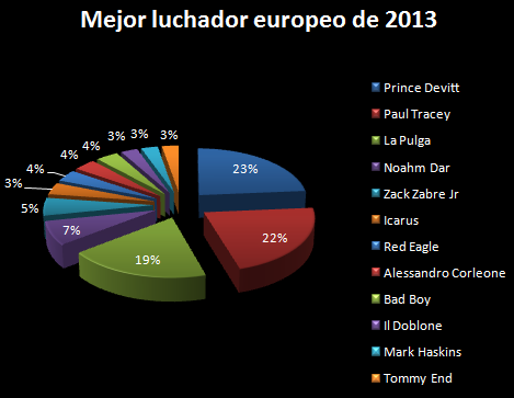 Tras haber revisado las votaciones de nuestros usuarios y haberlo anunciado en la edición de Xtreme Pressing aquí os dejamos el gráfico de las votaciones, en las que Prince Devitt ha conseguido proclamarse mejor luchador europeo de 2013. El irlandés que lucha para la NJPW logró imponerse a Paul Tracey que se queda en segunda posición. Tercer puesto merecidísimo para el español «La Pulga» seguido por quien también estará en el show de RCW, Noahm Dar.