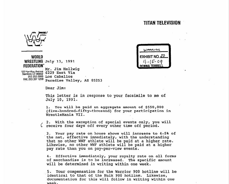 La carta de Warrior exigiendo dinero y la respuesta de Vince apareció enla red la semana pasada. Había habido historias que Warrior realidad exigía dinero del fin de semana del pago por visión , pero estas cartas demuestran que fue de 7 semanas antes del PPV . Vince estuvo de acuerdo en esencia con los nuevos términos, pero suspendió a Warrior justo después del evento. Podéis ver un PDF en este enlace. La respuesta de Vince y el enlace a su PDF también se encuentran aquí.