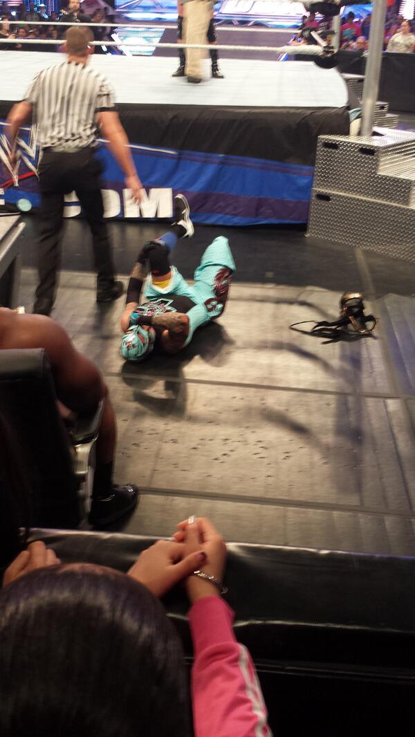 Rey Mysterio posiblemente sufrió una lesión durante el combate Fatal 4 Way de las grabaciones del martes contra Henry, Kofi y Swagger. Como se ve en la foto, Rey cayó mal y se fue al suelo rápidamente quitándose su rodillera de protección en un claro signo de dolor.
