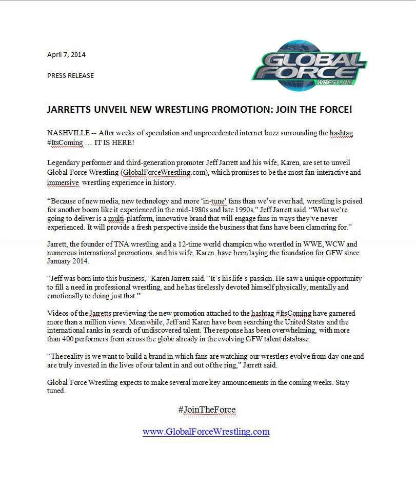 Jeff Jarrett ha anunciado esta tarde la creación de su nueva empresa de lucha llamada Global Force Wrestling (GFW). Jarrett lo ha hecho mediante una nota de prensa que os dejamos a continuación.