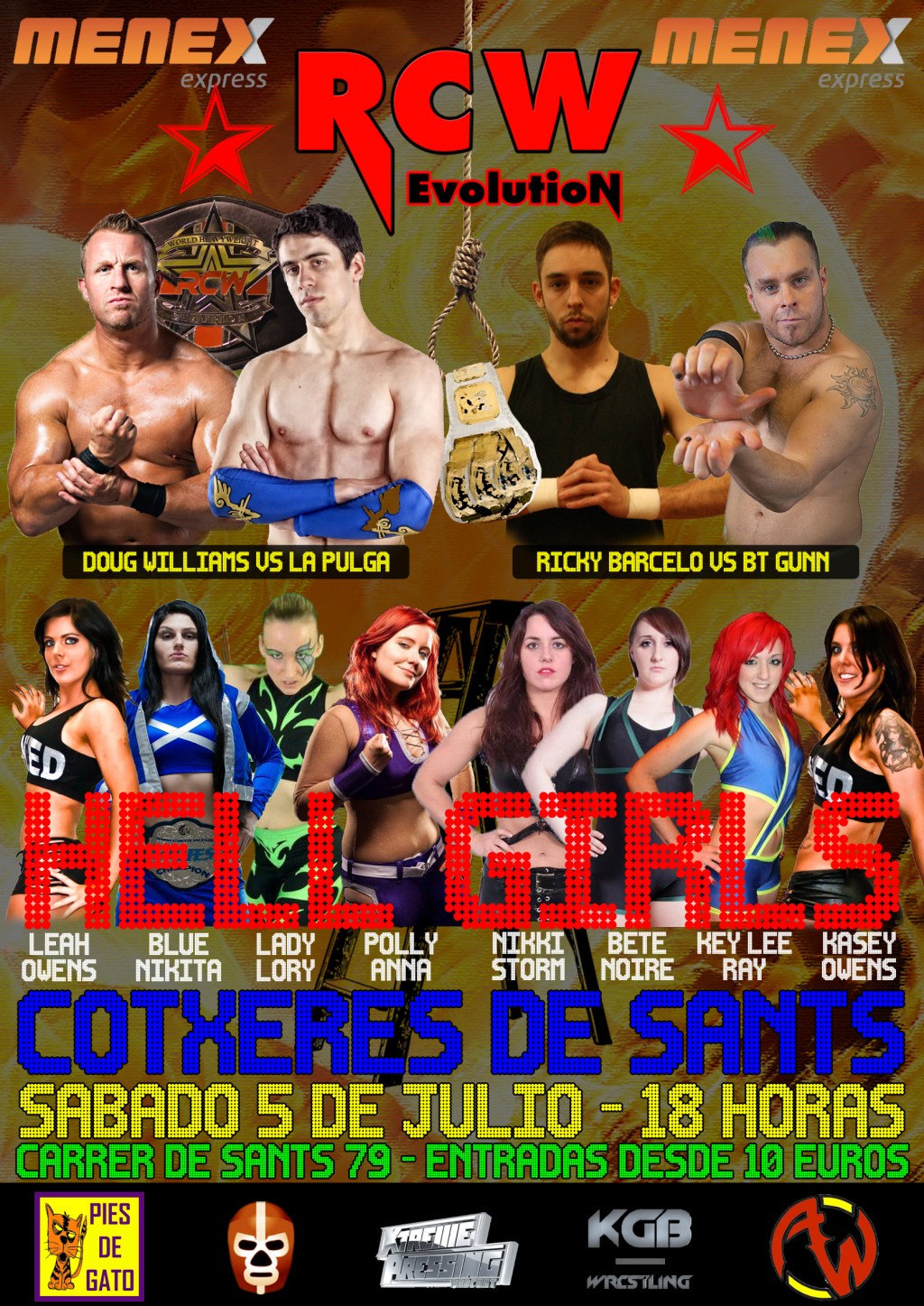 Después del éxito del primer show el pasado mes de febrero, Revolution Championship Wrestling (RCW) se enorgullece de presentar un nuevo show de Wrestling internacional en Barcelona «Hell Girls», el próximo sábado 5 de julio en LES COTXERES DE SANTS (Carrer de Sants 79) a las 18 horas, apertura de puertas 17:30.