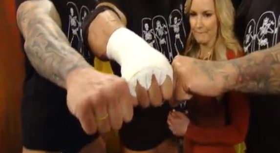 Kane saca un palo de kendo y golpea a Bryan. Bryan hace una super hurracarrana desde la esquina a kane y lo saca del ring. el combate está fuera de ring ahora.