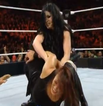 Hace el gesto del undertaker, levanta a Bryan pero se zafa de un tombstone. Ahora Bryan con una silla le aplica varios golpes. Intenta un candado pero Kane llega a un palo de Kendo. Bryan se lo quita, lo estrangula pero Kane sale del ring.