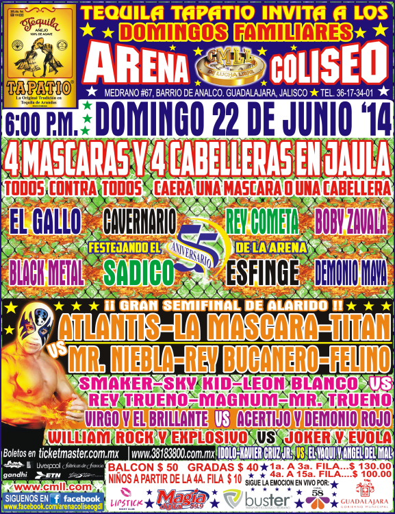 Se celebro jaula de apuestas, en la que Black Metal perdió la máscara ante Bárbaro Cavernario. En jaula en la que también participaron Gallo, Rey Cometa, Boby Zavala, Sádico, Esfinge, y Demonio Maya.