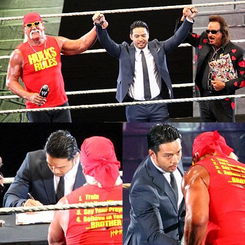 Esta es la instantánea de la firma de Kenta por la empresa de Vince McMahon, tal y como se ha dicho la storyline contada en Japón es que Kenta es el primer fichaje hecho por Hulk Hogan para WWE de ahi su aparición en el tour de Japón y en esta firma del contrato
