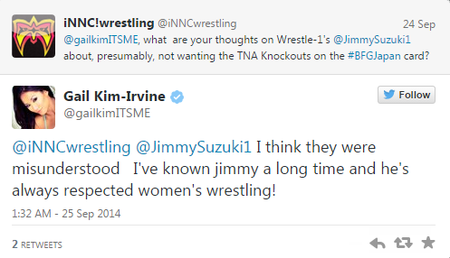 @INNC!Wrestling: «@gailkimitsme, ¿ que piensas sobre lo que dijo @jimmysuzuki en Wrestle 1, sobre que, presumiblemente, no quiere a las Knockouts de TNA en la cartelera de #BFGJapan ?»