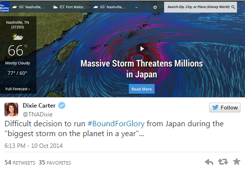 El tifón bautizado con el nombre «Vongfong», ha alcanzado la costa japonesa y, aunque como medida de precaución se ha valorado la posibilidad de sus pender el evento «Boung for Glory», que se celebrará mañana domingo, se esperaba que el show pueda llevarse a cabo sin ningún tipo de problema.