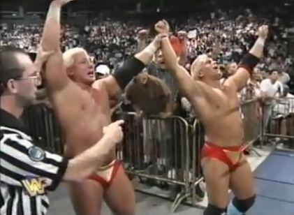 La pelea había comenzado lentamente y sin muchas cosas que destacar, hasta que cerca de la mitad Sunny se deja caer en ring side como si le hubiese pasado algo, por lo que Skip va a verla y ella le da una cachetada y luego los Gunns le aplican un lazo, pasando entonces a dominar el combate, aprovechando también de hacer trampas para mantenerla. Aún así el match no mejora, resolviéndose cuando Skip logra dar el relevo a su compañero quien dominaba pero Billy le toma la pierna y hace caer, por lo que Bart intentaba una movida pero al ser distraído el árbitro por Sunny y Billy, Skip aprovecha para lanzarse desde el esquinero con una patada voladora, cayendo su compañero sobre él, y llevándose la victoria
