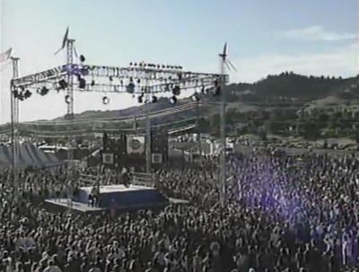 Nota: cabe señalar también que como era al aire libre (de hecho se ven los cerros atrás), la escenografía se ve realmente penca, la entrada parece sólo unos andamios con mallas que tenían el logo del evento, el camino hacia el ring era de tierra, y el ring estaba posicionado sobre una especie de pedestal que debe haber tenido 1.5 mt de altura aproximadamente.