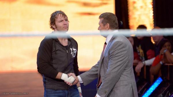 Dice que quiere que esta generación sepa lo que es ganarse el poder y no solo obtenerlo. Recuerda cuando ganó al gobierno de USA, a los directivos de WCW … los machacó a todos. Dice que por eso va a añadir algo más al combate, y que por eso si el equipo de La Autoridad pierde ya no será más La Autoridad. Dice que si pierden no estarán más en el poder, y dice que ellos pueden hacerlo, que cree en ellos … o quizás no. Stephanie y Hunter se van del ring con la música de Vince sonando pero suena la música de Dean Ambrose que llega y le da la mano a Vince. Vince le dice fuera de micro que ahora si que van a tener que demostrar que merecen el poder y se van. En la parte de abajo de las pantallas anuncian un Big Show vs Mark Henry para esta misma noche y Ambrose sube al ring mientras nos vamos a cortes comerciales.
