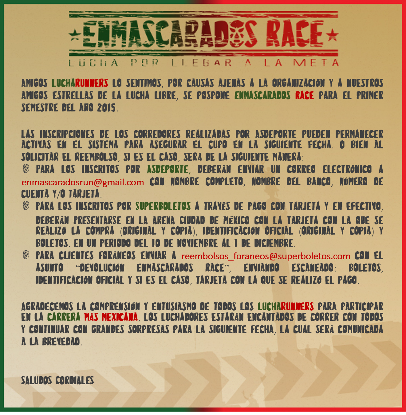 – Para los inscritos por Superboletos a través de pago con tarjeta y en efectivo, deberán presentarse en la Arena Ciudad de México con la tarjeta con la que se realizó la compra (original y copia), Identificación oficial (original y copia) y boletos. En un periodo del 10 de noviembre al 1 de diciembre. Para clientes foráneos enviar a reembolsos_foraneos@superboletos.com con el asunto “Devolución Enmascarados Race”, enviando escaneado: boletos, identificación oficial y si es el caso, tarjeta con la que se realizó el pago.