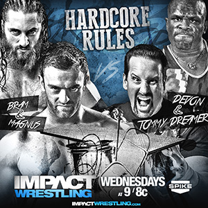 - Además tendremos un combate de reglas hardcore donde el nuevo rey del hardcore Bram hará equipo junto a Magnus para enfrentarse a Devon & Tommy Dreamer en un combate donde se podrán utilizar todas las armas a tu alcance.
