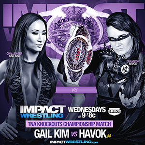 - El título de las Knockouts también estará en juego este miércoles en Impact después de haber recibido el alta, Gail Kim tiene muy claro que lo que quiere es recuperar el cinturón que le arrebató Havok, y no ha querido esperar más y ha reclamado para esta noche su combate de revancha por el título de las Knockouts.