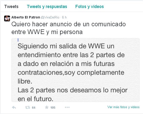 Según hemos podido saber por la cuenta oficial de Alberto del Río en Twitter, el luchador y WWE han llegado a un acuerdo para que esté totalmente libre de ser contratado en las promociones que lo demanden. Ambas partes se desean lo mejor para el futuro.