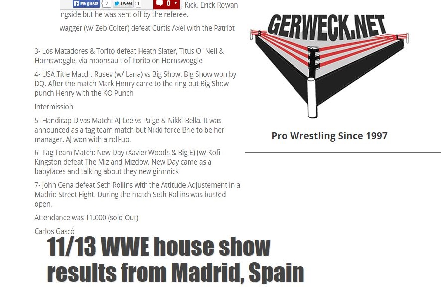 Una vez más, y como podéis ver por las capturas de pantalla, algunas de las más importantes webs especializadas sobre wrestling del mundo anglosajón (gerweck.com, rajah.com, pwi-online.com y el observer) han elegido la información de http://www.kgb-wrestling.com para informar sobre el house show de WWE en Madrid este pasado 13 de noviembre.