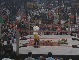 Desde el comienzo Hardy sube un par de escaleras al ring y las utiliza para atacar a Jarret de distintas formas, sin embargo, el dominio llega a su fin cuando Hardy intenta un senton bombazo sobre la escalera que JJ evita. Más tarde el combate se emparejaría con ataques de ambos hasta que cuando Hardy subía la escalera aparece Scott Hall que lo toma y aplica el Razor’s Edge, siendo sacado por la seguridad del ring pero quedándose sentado en ring side, volviendo a intrometerse minutos más tarde ya sea atacando a Jeff o recibiendo los ataques de este o de las caídas de ambos luchadores desde las escaleras. En el combate intentan mostrar movidas variadas y arriesgadas, pero no les resultan del todo bien, a ratos se ven algo dubitativos y más de algún movimiento salió botcheado o casi botcheado, por ejemplo al final cuando quedan ambos luchadores sobre la escalera y Hardy intenta un bombazo desde ahí pero Jarret se afirma y sale mal, lo mismo el bombazo que intentan segundos después en ring side donde nuevamente al afirmarse Jarret, la movida sale mal. Como era de esperar, Hall vuelve a intrometerse y permite al campeón golpear con una silla a su rival, y mientras escalaba, con el combate prácticamente ganado, suena la música de Kevin Nash quien ingresa con un par de guitarras en cada mano, llegando al ring donde le pasa una a Hall y todos los presentes golpean con ellas a Hardy que había aprovechado de levantarse e intentar sacar el campeonato, permitiendo así la victoria de Jarret.