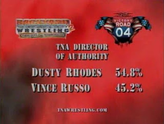 Nos pasan un video de la campaña de Dusty Rhodes, quien participa por ser la principal autoridad por la compañía ante Vince Russo (actualmente en esa posición) y cuya decisión será tomada por los espectadores a través de una votación telefónica que culminará con el ganador siendo anunciado antes del Main Event del ppv. De esta forma, en el video nos hablan de sus principales cualidades para ocupar ese cargo (de Rhodes), como lo son su experiencia, conocimiento, y entendimiento del negocio. Luego nos muestran las votaciones que hasta el momento dan la ventaja a Dusty con un 54.8% contra el 45.2 de Russo.