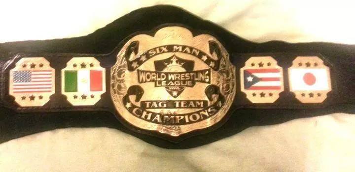 Como podemos apreciar están presentes las banderas de los principales países en los que este deporte goza de mayor popularidad. Estados Unidos, México, Puerto Rico y Japón. En el centro de la placa dorada tenemos el logo de la WWL rodeada por la denominación de titulo colectivo (Tag Team Champion) y el número de hombres que se verán envueltos en la disputa por ser portadores de esta correa (six man).