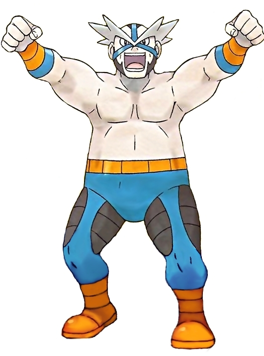 A pesar de que no se ocupa del tipo lucha va equipado completamente con un equipo de luchador profesional, del que destaca la máscara que cubre parcialmente su cara. No queda ahí su relación con la lucha ya que es juez del gran concurso Pokémon de su ciudad, donde elige de entre todos los participante a los Pokémon más destacados, tal y como hacen los entrenadores de los territorios en desarrollo de las empresas de lucha libre en la vida real.