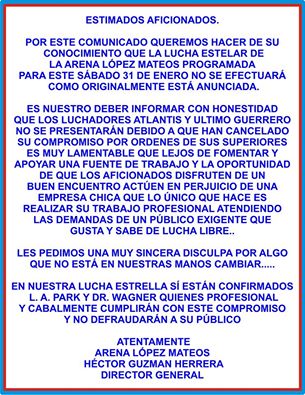 Los luchadores Atlantis y Último Guerrero han cancelado su aparición en la Arena Lopez Mateos, según han informado los responsables de a arena por órdenes de sus superiores. Aquí os dejamos el comunicado de prensa.