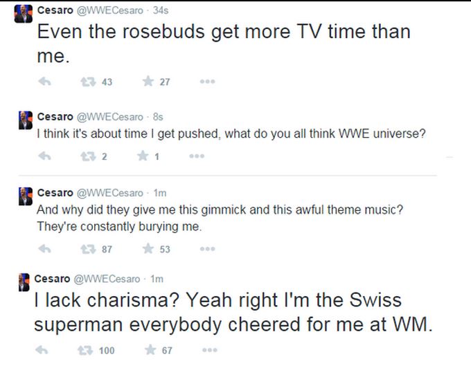 La cuenta de Twitter de Cesaro fue hackeada esta mañana. El hacker envíó tweets que cuestionan el por qué Cesaro no estaba teniendo su merecido push, y también decía que ojalá a Vince McMahon «le da un cáncer.»