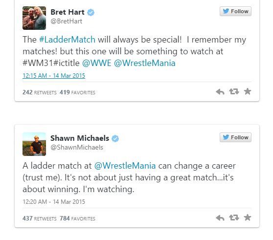 Después de que Scott Hall twitteó sobre el Intercontinental Champion Ladder Match a de la WWE en WrestleMania 31, Bret Hart y Shawn Michaels también comentaron ayer por la noche. Ellos escribieron: