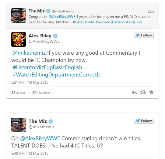 The Miz recibió una gran cantidad de comentarios de los fans en las redes sociales anoche por su sarcástica «felicitación» via twitter a su ex socio Alex Riley por su regreso al ring en WWE NXT. Los dos continuaron el intercambio en Twitter ayer por la noche.